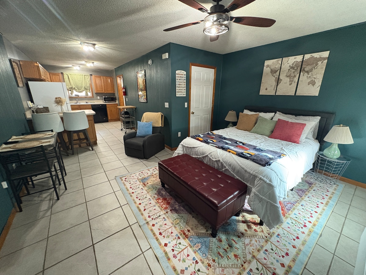 Sleep peacefully in this 600 square foot fully furnished guest apartment located off I-70 frontage in Oak Grove on 18 acres with 2 ponds and rolling pasture. A gravel drive leads to the property where you'll have a concrete parking place and a step-free, pavestone walkway to the front door of the apartment. Rest soundly on a queen size Tuft n Needle mattress in a bedroom with room darkening shades and various pillows to satisfy your comfort. Fully equipped kitchen, laundry room, 2 smart TVs.