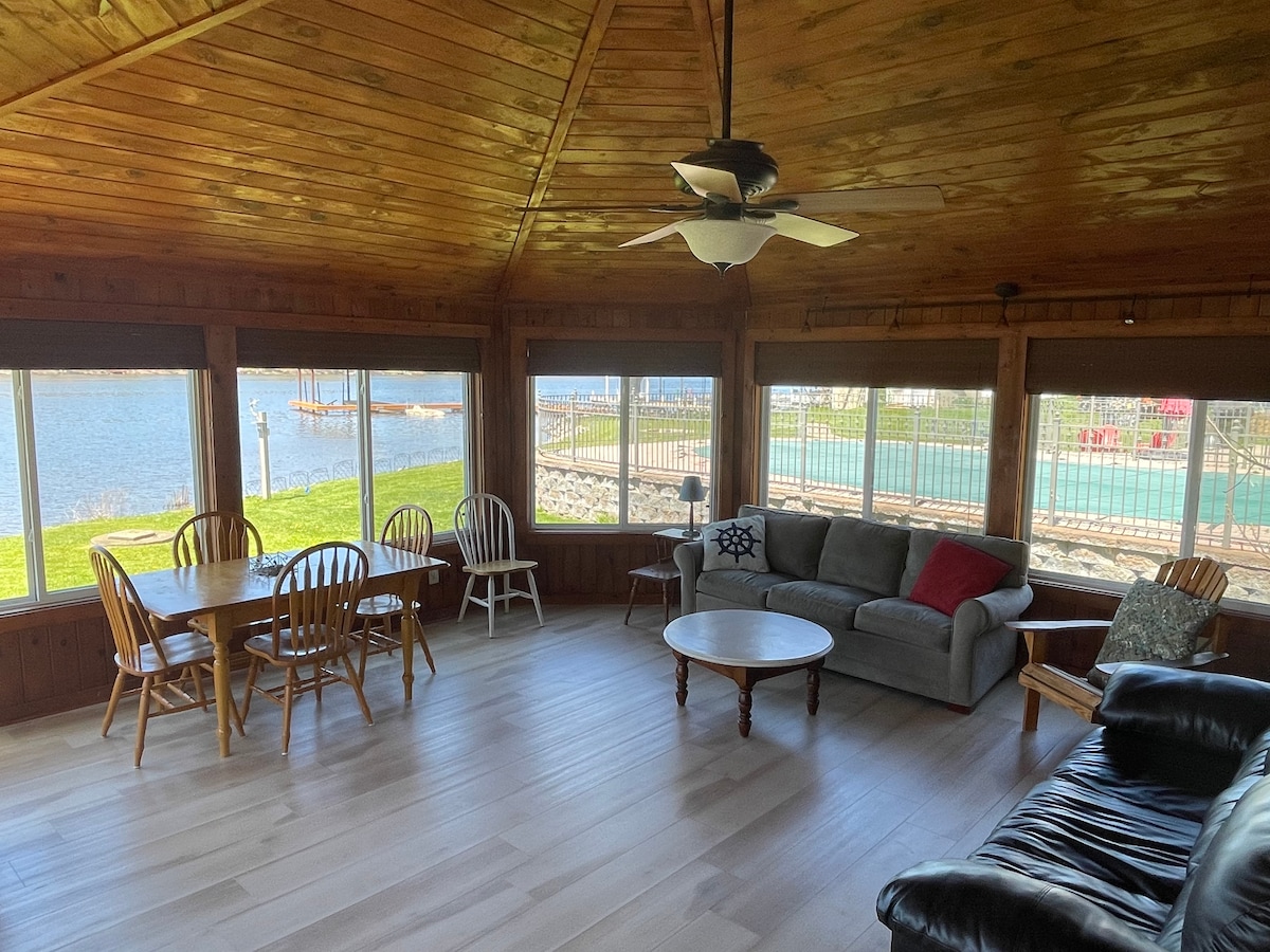Escape to our cozy 2-bedroom cottage on East Bay minutes from Chimney Bluffs! This retreat sleeps up to 6 guests, featuring two queen beds and a sofa bed. Enjoy stunning water views, a mounted fireplace, and three Smart TVs for relaxing evenings. The cottage includes a fully equipped kitchen and a large deck with a propane firepit—perfect for cozy nights under the stars. Step out onto the dock for fishing and kayaking, or stay connected at the dedicated work space with fast Wi-Fi.