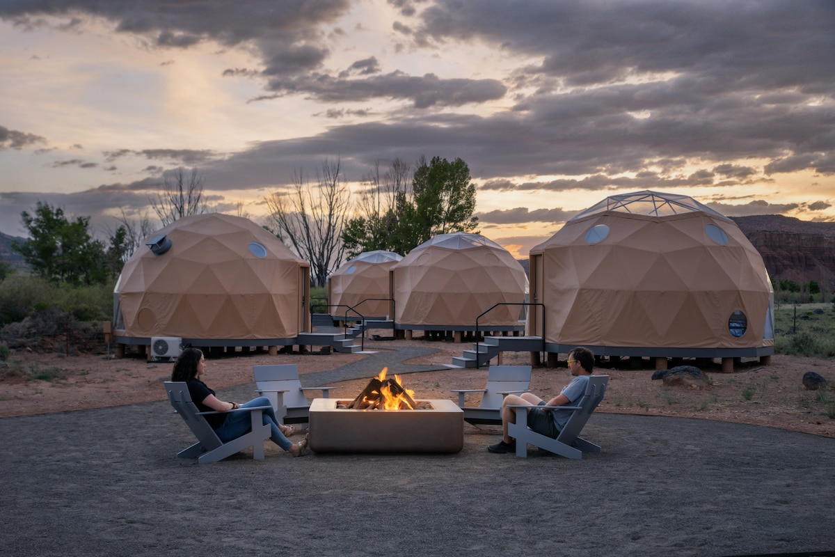 स्कायव्ह्यू हॉटेलमधील आमचे ग्लॅम्पिंग किंग स्कायलाईट डोम सर्व आधुनिक सुखसोयींसह उंचावलेला कॅम्पिंग अनुभव देते. किंग बेडच्या अगदी वर असलेल्या स्कायलाईटसह ताऱ्यांच्या खाली झोपण्याचा अनुभव घ्या आणि आराम करा. आमच्या आधुनिक लाउंज सीटसह आराम करा आणि मध्यवर्ती फायर पिटमधील दृश्यांचा आनंद घ्या (S'ores आमच्यावर आहेत). लक्झरी बेड आणि बाथ लिनन्स, स्थानिक पातळीवर मिळणारे विनामूल्य ट्रीट्स आणि अंदाजे 150 फूट अंतरावर असलेल्या तुमच्या स्वतःच्या खाजगी मध्यवर्ती बाथरूमचा आनंद घ्या.