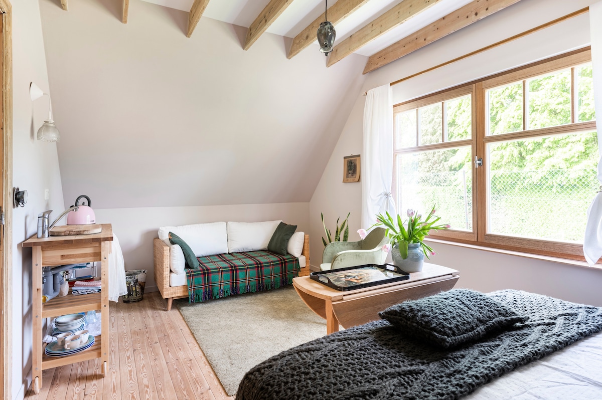 Discover the charm of the countryside near historic Bruges. Rural studio in a wooded area. Bruges and the coast easily accessible. Private entrance, private shower and toilet. Studio on the first floor, entrance and toilet on the ground floor. Ecological bed and mattress. Kitchenette and sitting area. Wild garden. Cycling junction in our street. Bus stop nearby (6 min.) Smooth bus connection to and from Bruges. (At 1/2 hour) Grocery stores and bistros in the immediate vicinity.
