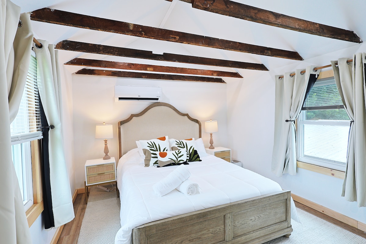 टीप: तुमच्या संरक्षणासाठी असलेल्या हाताने स्पर्श करणार्या जागांचे अतिरिक्त सँटायझिंग. 18 व्या शतकाच्या उत्तरार्धात या निवडक 2 - मजली डुप्लेक्समध्ये जुने आणि नवीन आकर्षण दोन्ही आहे. सिंगल BR आणि बाथ वरच्या मजल्यावर; LR आणि किट खालच्या मजल्यावर. मेन सेंट रेस्टॉरंट्स आणि अनोख्या दुकानांपासून फक्त 1 ब्लॉक. सर्वांचे स्वागत आहे. कृपया तुमचा स्वतःचा बाळ बेड आणा. माफ करा पाळीव प्राणी नाहीत. 1 वाहनासाठी विनामूल्य रिझर्व्ह पार्किंग आणि जलद वायफाय. तात्काळ बुकिंग चालू आहे. आमच्या घरात पूर्णपणे धूम्रपान किंवा कोणत्याही प्रकारच्या परवानगी नाही.