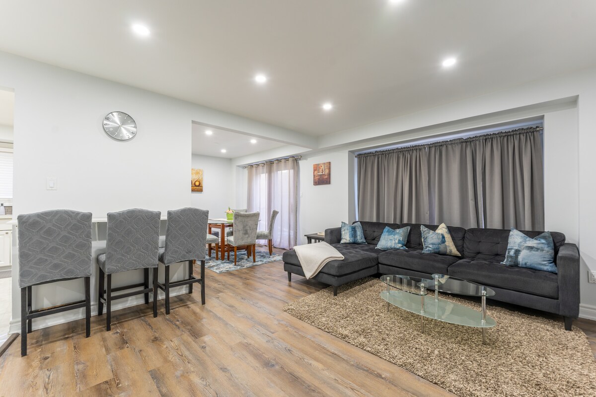 तुमच्या घरापासून दूर असलेल्या घरात तुमचे स्वागत आहे!! डाउनटाउन व्हिटबीच्या अगदी बाहेर आणि Hwy 401 आणि 407 पर्यंत काही मिनिटांच्या अंतरावर असलेले स्वच्छ, उबदार आणि अपवादात्मकपणे सुशोभित लक्झरी घर. या ट्रेंडी टाऊनहोममध्ये अनेक सजावट आहेत आणि तुमच्या हृदयाला हव्या असलेल्या सर्व सुविधांनी भरलेले आहेत. 2 किंग बेड्स, 2 क्वीन बेड्स आणि 2 पूर्ण सोफ्यांसह सुसज्ज हे मॉडर्न टाऊनहोम मध्यम ते मोठ्या आकाराच्या कुटुंबासाठी किंवा मूठभर मित्र किंवा सहयोगींसाठी परिपूर्ण अल्पकालीन किंवा दीर्घकालीन वास्तव्य शोधत आहे.