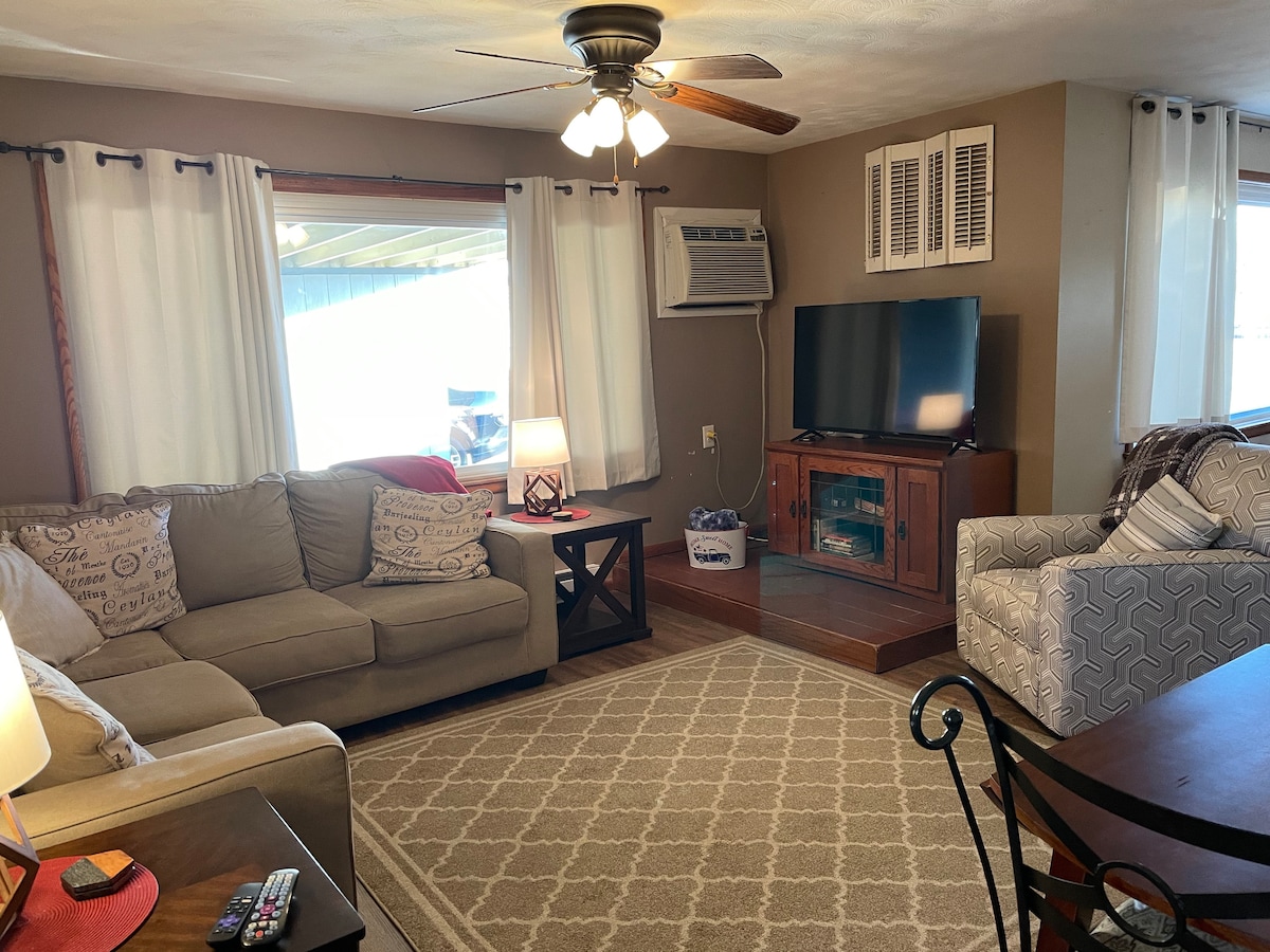 पार्क प्लेसच्या आमच्या आवृत्तीमध्ये तुमचे स्वागत आहे! त्या संध्याकाळच्या पायी किंवा गूफी गोल्फच्या गोलसाठी रे फोसे पार्कपासून रस्त्याच्या पलीकडे स्थित. मोठ्या स्क्रीनवरील टीव्ही आणि आरामदायी सेक्शनल आणि खुर्च्या असलेली प्रशस्त लिव्हिंग रूम. 2 BR ऑन मेन लेव्हल स्लीप 4 आणि वर एक किंग साईझ बेड. वरच्या मजल्यावरील बोनस एरियामध्ये अतिरिक्त बेड म्हणून फोल्ड आऊट सोफा समाविष्ट आहे आणि तो वाचण्यासाठी, काम करण्यासाठी किंवा आराम करण्यासाठी उत्तम आहे. टीव्ही, विनामूल्य वायफाय, विनामूल्य कव्हर केलेले पार्किंग, साईटवर वॉशर/ड्रायर, सुंदर बॅक यार्ड, ग्रिल आणि बरेच काही!