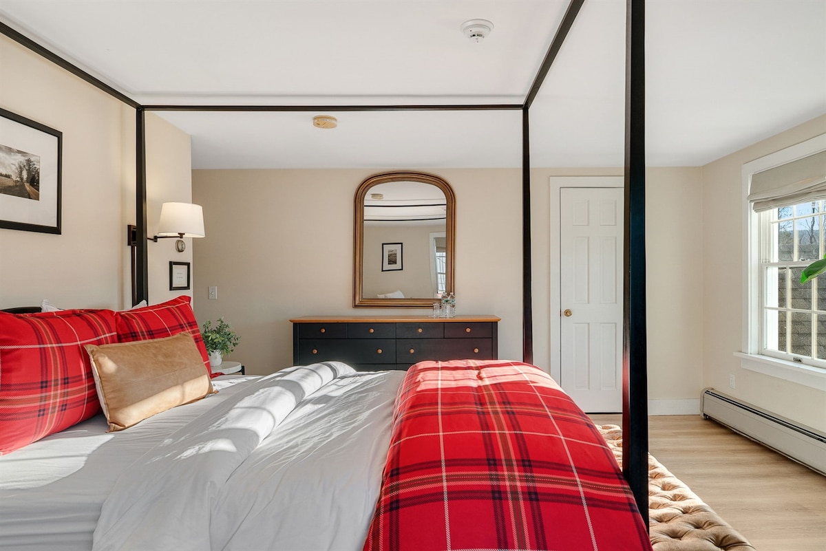 नॉर्विचच्या मध्यभागी स्थित, हे आधुनिक टाऊनहोम - शैलीचे निवासस्थान आमच्या निवासस्थानाशी जोडलेले एक विंग आहे. तुमच्या वरच्या मजल्यावरील मास्टर सुईट + ऑफिस/2 रा बेडरूम, खालच्या मजल्यावरील "कॅफे" आणि सर्व - सीझन सनरूमचा आनंद घ्या. बाग आणि जंगलांच्या पलीकडे असलेल्या दृश्यासह आराम करा. आम्ही हॅनोव्हर/डार्टमाऊथपासून 1.5 मैल आणि किंग आर्थर बेकिंगपासून 1.0 मैल अंतरावर आहोत. आमचा रस्ता अपालाशियन ट्रेलचा भाग आहे आणि तुम्ही अनेक अप्पर व्हॅली आकर्षणे जवळ असाल. आम्ही ऑनसाईट राहतो आणि विनंतीनुसार तुम्हाला मदत करण्यासाठी उपलब्ध आहोत.