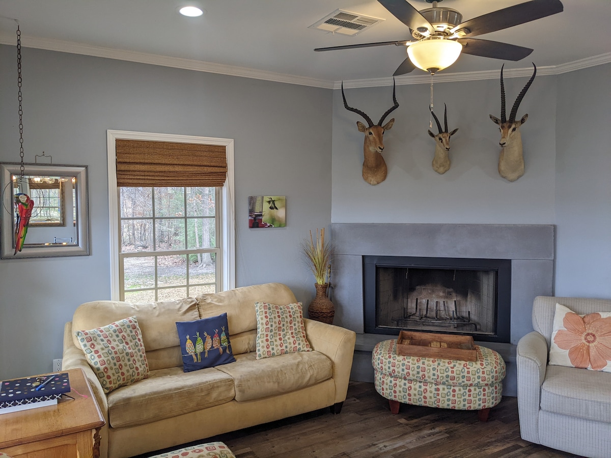 3 BR/2 BA घर, स्टेनलेस उपकरणे, वॉशर आणि ड्रायर, डिशवॉशर, कचरा विल्हेवाट लावणे, विनामूल्य वायफाय, डायरेक्ट टीव्ही, स्मार्ट टीव्ही (1) असलेले पूर्ण किचन. सेंट्रल एअर आणि हीट. समोरच्या पोर्चपासून सुंदर 2.5 एकर साठा असलेल्या तलावाच्या पायऱ्या. फिशिंग पियर, ॲडिरॉंडॅक खुर्च्यांसह फायर पिट. तुमच्या बोटीसाठी जागा असलेली पुरेशी पार्किंग. ड्युअल बार्बेक्यू ग्रिल गॅस किंवा कोळसा वापरते. कुटुंबासाठी अनुकूल प्रॉपर्टी! शिकार करण्याची परवानगी नाही. भाड्याने देण्यासाठी 28 असणे आवश्यक आहे.