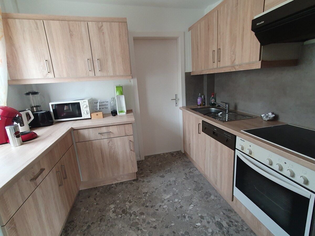 Gemütliche Wohnung, mit einer gut ausgestatteten Küche! Das Wohnzimmer hat eine Essecke , Fernseher und Stereoanlage. 3 gemütliche Schlafzimmer mit je 2 Betten sind vorhanden. Längerer Aufenthalt möglich :) Preis hierfür auf Anfrage. Ebenso auf Anfrage kann man an manchen Tagen eher einchecken. E-Bikes und Fahrräder können auf der zur Wohnung gehörenden Terrasse abgestellt werden. Die Terrasse ist nur für die Gäste der Ferienwohnung abschließbar zugängig und stehen daher vor Diebstahl sicher!