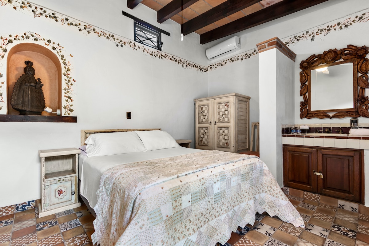 Esta encantadora habitación está construida en piedra volcánica y cantera, lo que le otorga un toque rústico y acogedor. El piso de barro, combinado con los detalles de mosaico de talavera en el baño, crea una atmósfera cálida y auténtica. Los roperos de madera apolillada añaden un aire vintage y lleno de carácter, mientras que las cenefas pintadas a mano adornan las paredes, reflejando la tradición y el arte local. Un espacio perfecto para quienes buscan una experiencia única y genuina.