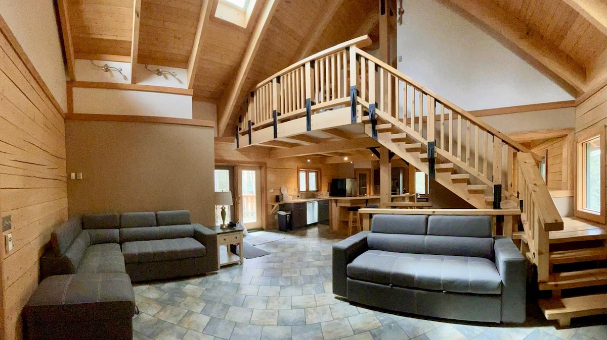 Chasing Cadomin is a stunning open concept log chalet perched on the side of Leyland Mountain. Where family friendly adventures begin as well as a romantic getaway. Enjoy your morning coffee, while gazing at the eastern slopes for the sunrise to come up over the magnificent Rocky Mountains. While listening & watching for birds & wildlife as the McLeod River rushes by. Spend the evening observing the bright stars/moon. Experience hiking/ATV trials, wildlife, fishing, pool table, air hockey, darts