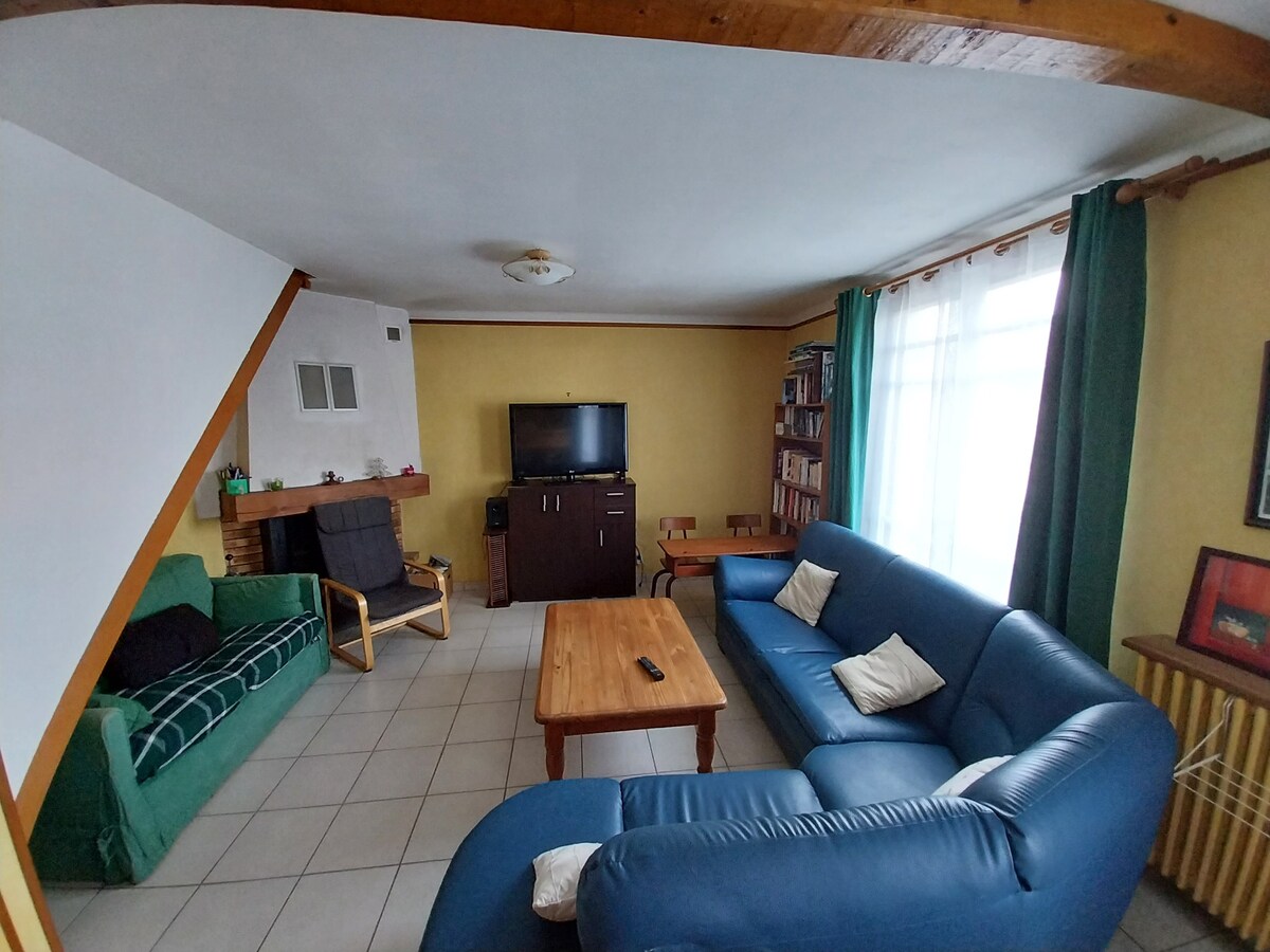 अतिशय आनंददायी नदीजवळील शांततेत लहान सह - प्रॉपर्टी लाकडी फ्रेम. दुसऱ्या मजल्यावर (लिफ्ट नाही) डुप्लेक्स अपार्टमेंटचा प्रकार 2: डायनिंग एरिया असलेली लिव्हिंग रूम, 2 - सीटर सोफा कन्व्हर्टिबल नाही, सुसज्ज किचन एरिया आणि टॉयलेट . दक्षिण - पश्चिम बाल्कनी. वरच्या स्तरावर डबल बेडसह 1 बेडरूम 140x190 बाथरूम WC. सर्व दुकानांसह शहराच्या मध्यभागी असलेल्या यफिनिआक शहराच्या जवळ. सेंट ब्रायकजवळ 6 किमी 10 किमी अंतरावर सुंदर बीच GR34 500 मिलियनच्या जवळ व्हेलोरआऊट 500 मिलियनच्या जवळ वायफाय धूम्रपान नाही