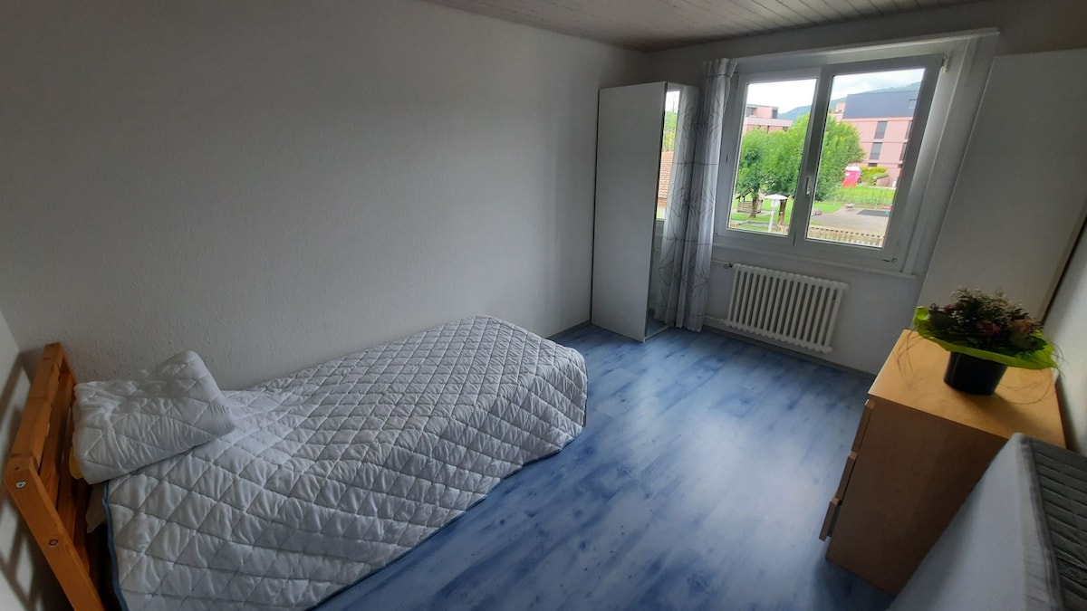 या शांत आणि मध्यवर्ती घरात साध्या जीवनाचा आनंद घ्या. अपार्टमेंट उज्ज्वल आणि प्रशस्त आहे. जगण्यासाठी तुम्हाला आवश्यक असलेले सर्व काही त्यात आहे. तुम्ही 7 मिनिटांत रेल्वे स्टेशनवर जाऊ शकता, तेथून तुम्ही सार्वजनिक वाहतुकीद्वारे 30 मिनिटांत बाझेल, बर्न, ल्युसेरिन आणि झुरिचपर्यंत पोहोचू शकता. विविध शॉपिंग सुविधांसह सिटी सेंटर पायी 5 मिनिटांच्या अंतरावर आहे. तुम्ही बाल्कनीत एक छान नाश्ता करू शकता. एक लहान जिना बाल्कनीतून लाउंज असलेल्या एका लहान समोरच्या गार्डनमध्ये जातो.